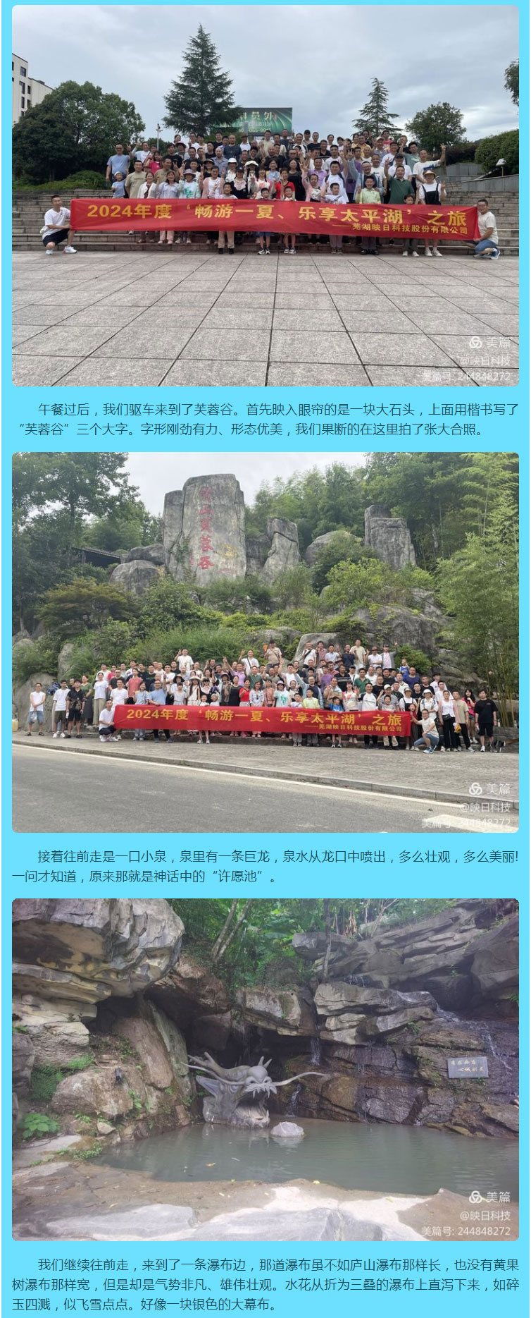 2024年度蕪湖映日科技股份有限公司“暢游一夏、樂享太平湖”之旅圓滿成功! 來源: 發(fā)布時(shí)間:2024-08-05 上一條:“盡享元宵、諸事圓滿”蕪湖映日科技股份有限公司元宵節(jié)活動(dòng)圓滿成功! 下一條:“追憶崢嶸歲月,禮贊黨的輝煌”慶“七一”主題黨日活動(dòng)!